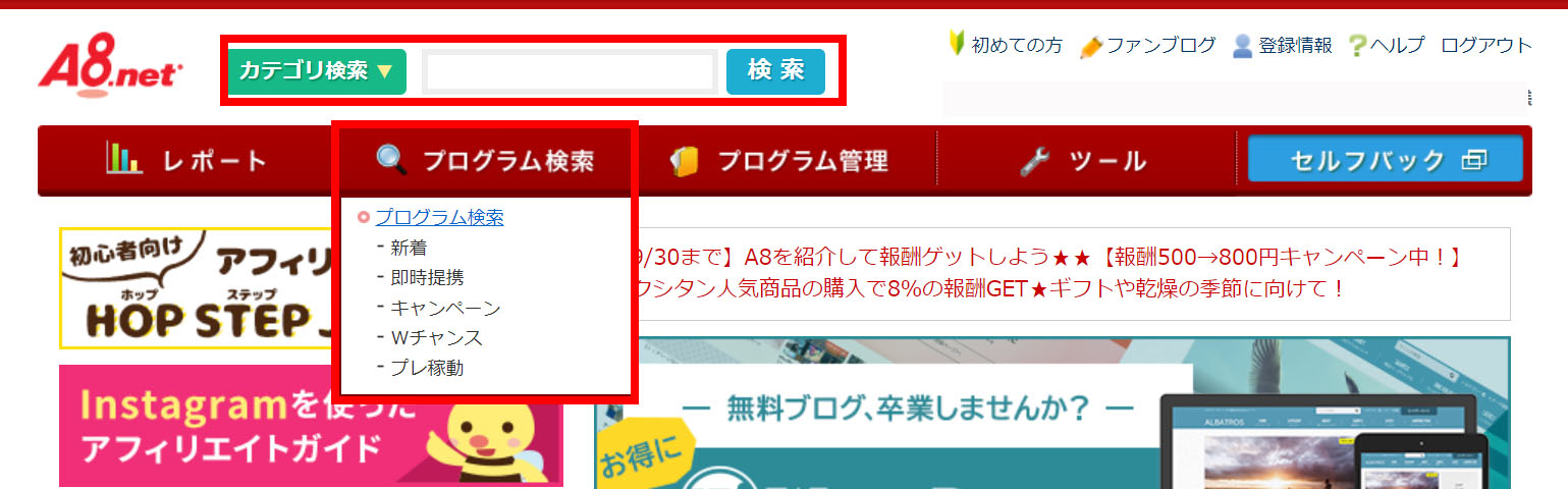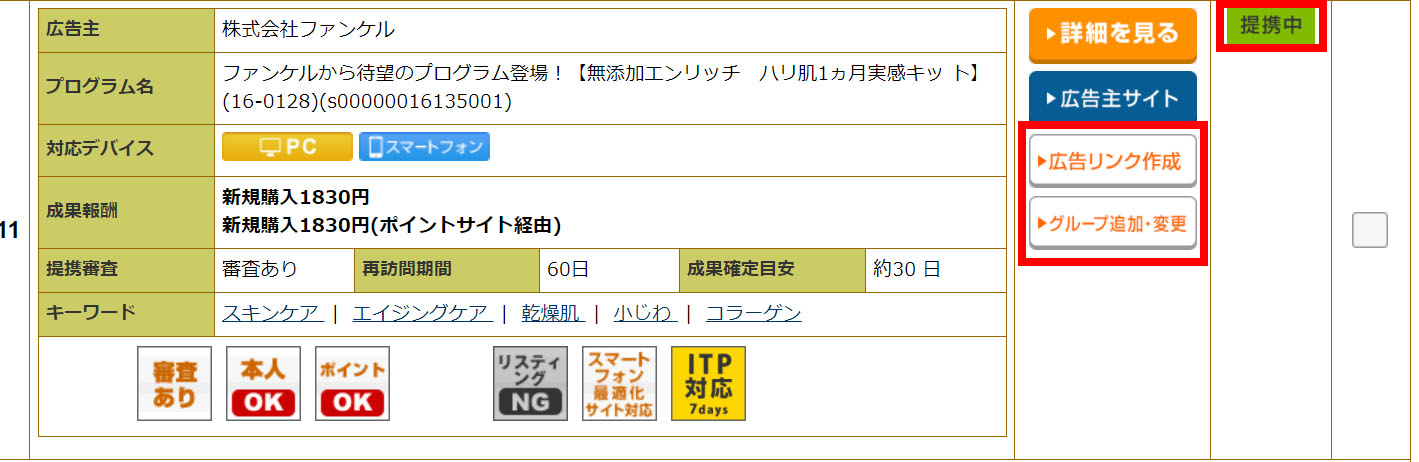 ③ 登録したら、案件を検索→提携申請→承認→広告リンク作成→サイト内へ挿入でアフィリエイトスタート。