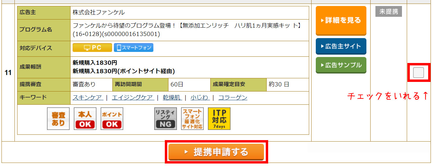 どのASPでも、リンクを挿入したい案件には「提携申請」をする必要があります。