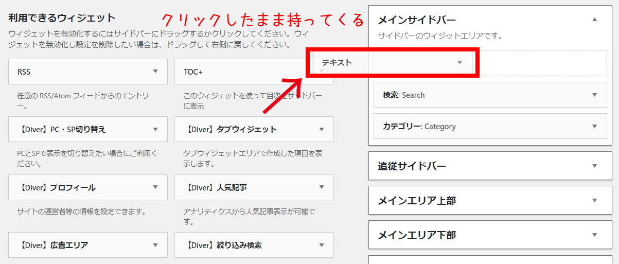 ② ウィジェットの中から「テキスト」をクリックし、右側の「メインサイドバー」へ移動させる