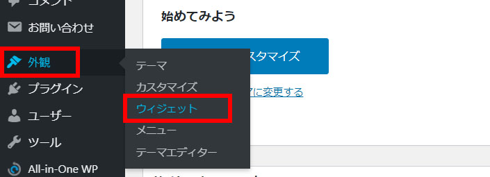 ① ワードプレス管理画面より「外観」→「ウィジェット」