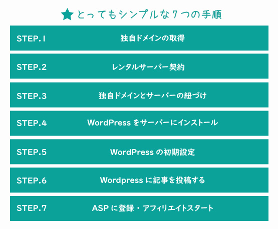 上から順番通りに進めれば、誰でもアフィリエイトブログをはじめる事ができます。