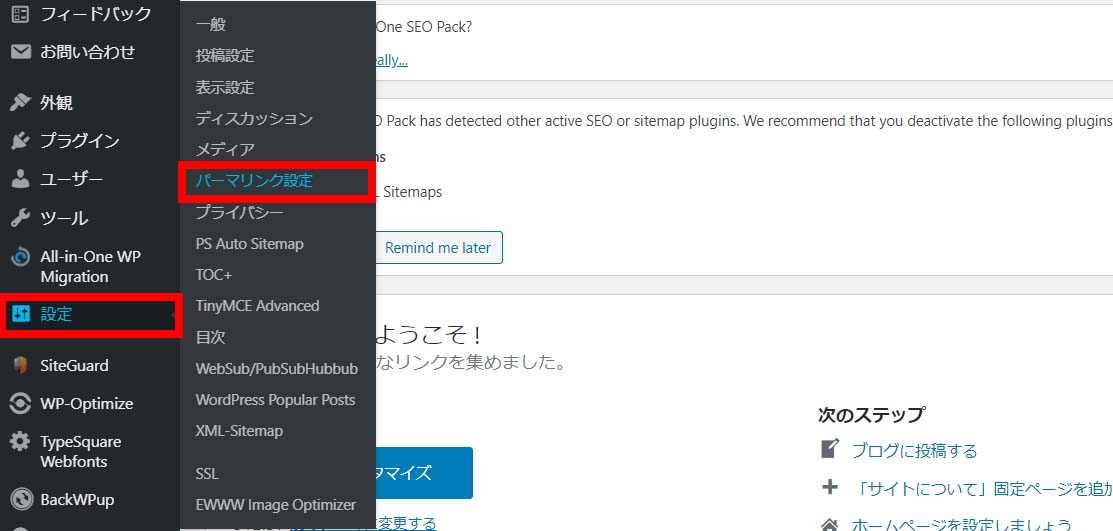 ① ワードプレス管理画面より「設定」→「パーマリンク設定」