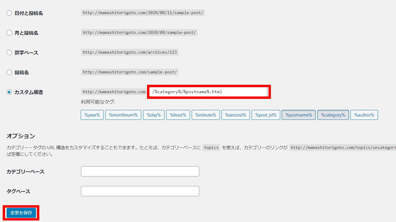 ③ パーマリンクの設定はSEO上有利とされている「/%category%/%postname%.html」にしましょう。