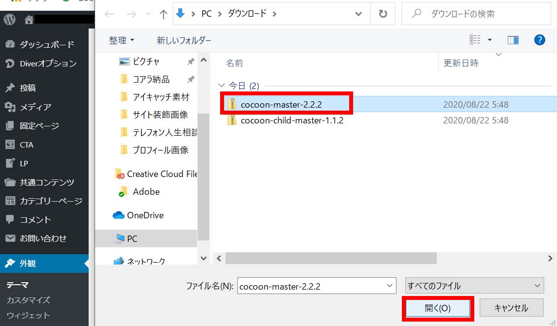 ② パソコンの「ダウンロード」内に親テーマ・子テーマの圧縮ファイルが保存されている事を確認