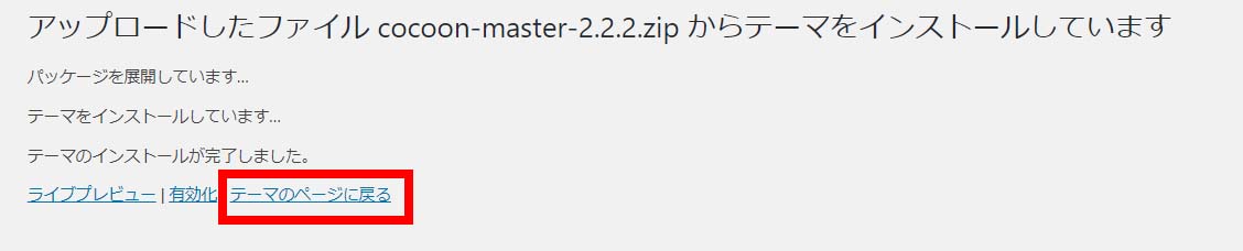 ⑦ インストールが完了しましたと出たら「テーマのページに戻る」
