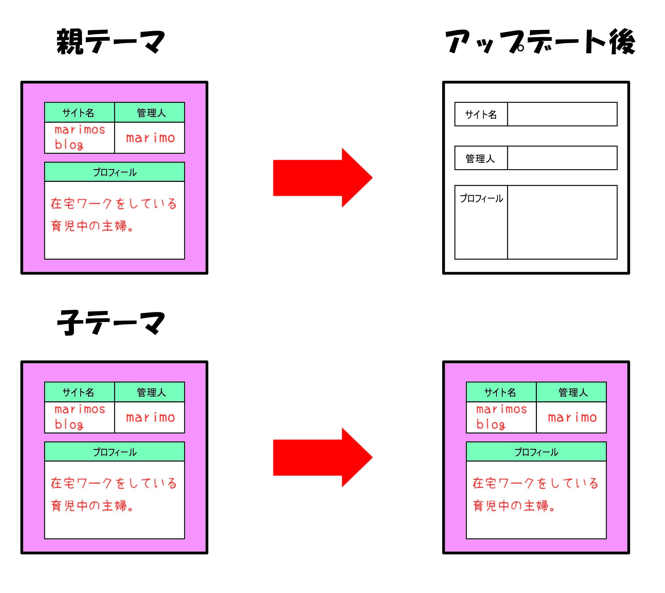 しかし、子テーマを使用していれば、親がアップデートされてもカスタマイズした内容が元に戻る事はありません。