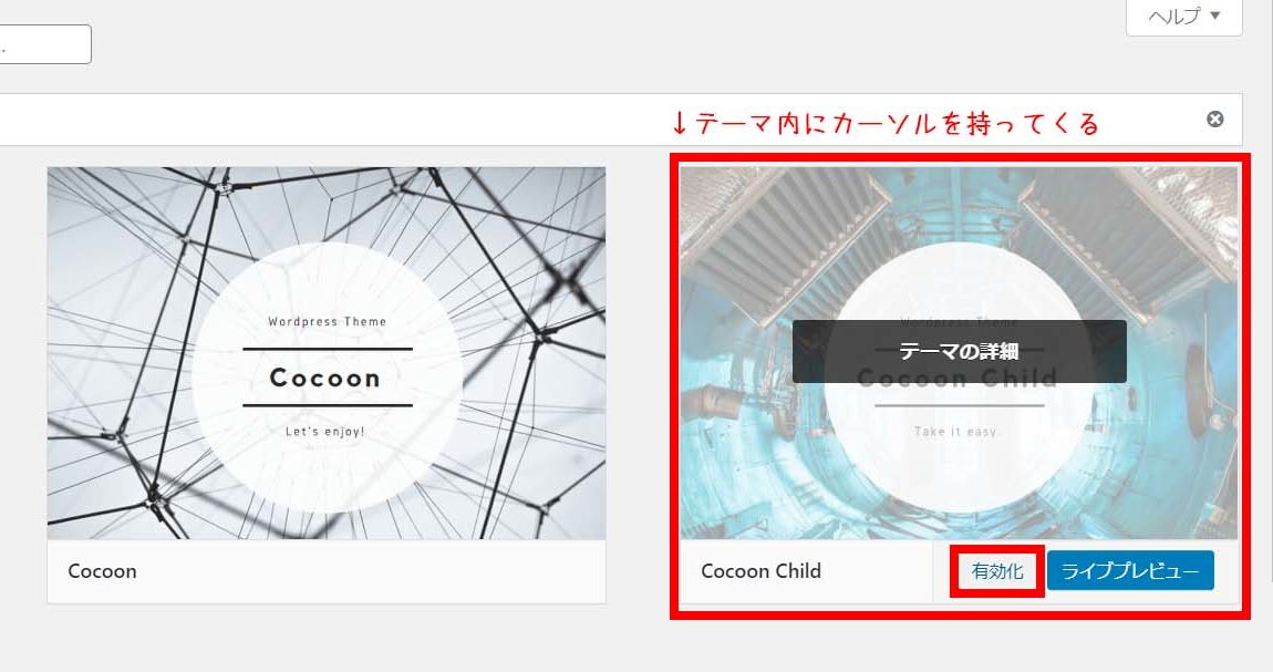 ② 子テーマにカーソルを持ってくると「有効化」ボタンが表示されるのでクリック