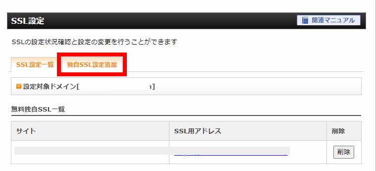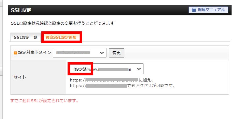 ① 「独自SSL設定追加」タブをクリックして対象ドメインに(設定済)という文字が追加されていればOKです。