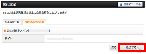 こちらのメッセージが出てしまった方は、ネームサーバー変更が反映されたのを確認してから、手動で独自SSL設定を行う必要があります。