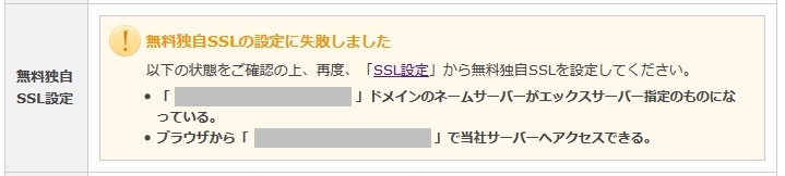 エックスサーバーで独自ドメインを追加すると、「無料独自SSL設定に失敗しました」というエラーが出てくる事があります。
