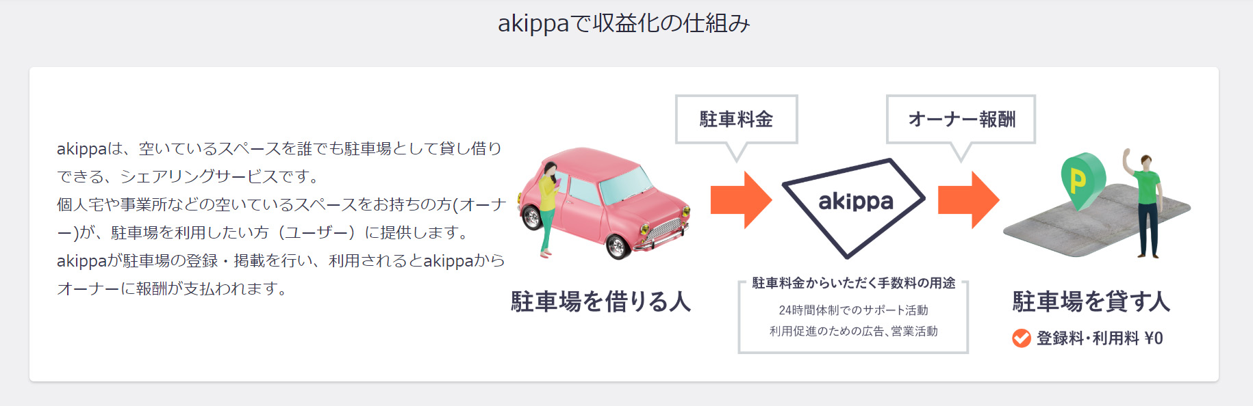akippaは、空きスペースを駐車場として貸し出せるサービスです。